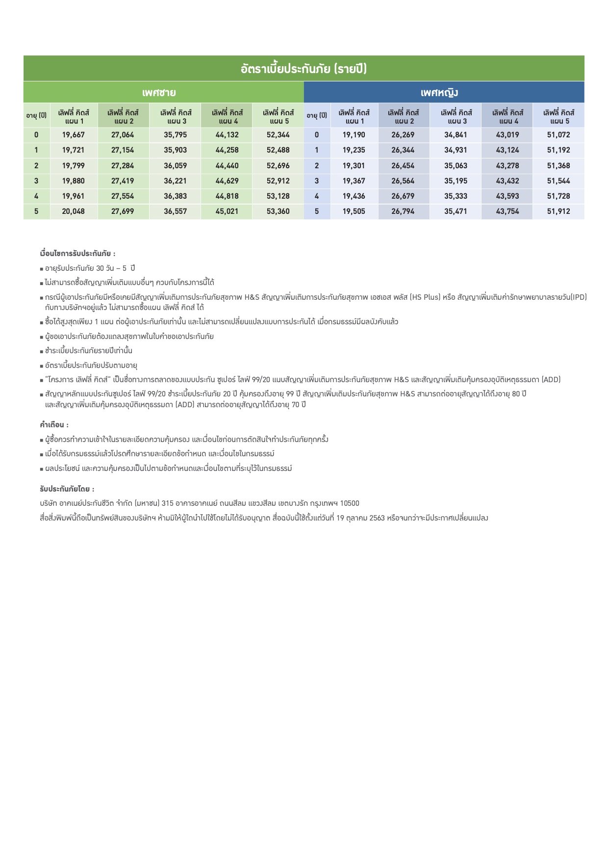 สัญญาหลักแบบประกันซูเปอร์ ไลฟ์ 99/20 ชำะเบี้ยประกันภัย 20 ปี คุ้มครองถึงอายุ 99 ปี สัญญาเพิ่มเติมประกันภัยสุขภาพ H&S สามารถต่ออายุสัญญาได้ถึงอายุ 80 ปี